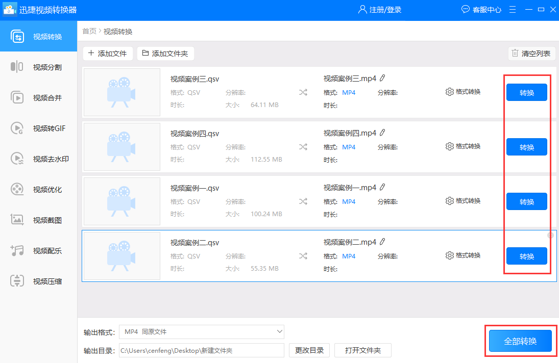 这些主要的转换参数调整好后点击转换或全部转换选项视频转换器就会把添加好的qsv格式批量转换成所选的mp4。