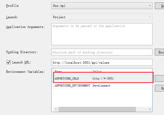 综上所述,asp.net core启动的时候会自行读取环境变量里面的配置,实际点就是在项目属性里面增加如下配置: