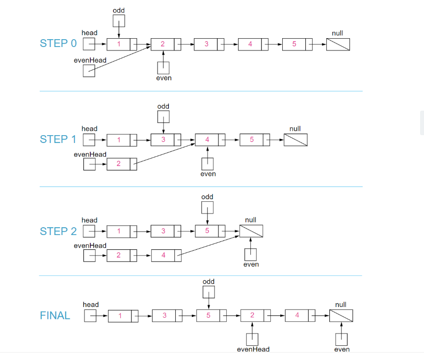这个解法非常符合直觉思路也很简单。但是要写一个精确且没有 bug 的代码还是需要进行一番思索的。 一个 LinkedList 需要一个头指针和一个尾指针来支持双端操作。我们用变量 head 和 odd 保存奇链表的头和尾指针。 evenHead 和 even 保存偶链表的头和尾指针。算法会遍历原链表一次并把奇节点放到奇链表里去、偶节点放到偶链表里去。遍历整个链表我们至少需要一个指针作为迭代器。这里 odd 指针和 even 指针不仅仅是尾指针,也可以扮演原链表迭代器的角色。