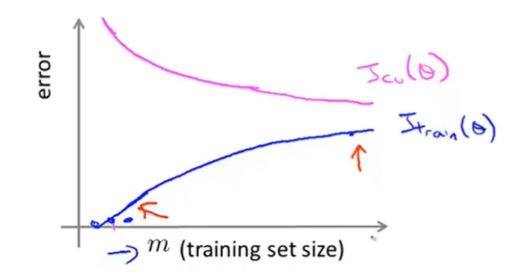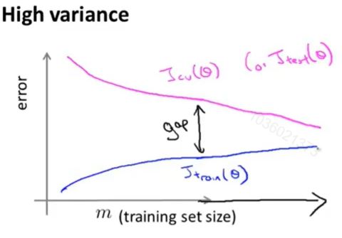 (2)训练集误差小、交叉验证集误差却很大:过拟合、高方差、多项式次数d太大、λ太下、样本量太少。