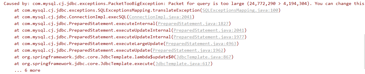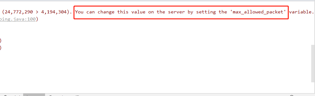 如果我们不修改mysql配置直接插入会出现下面的错误提示,并且会提示我们配置 max_allowed_packet 参数,原因是插入的数据太大。除了这个配置,我们再加一个配置 innodb_buffer_pool_size(innodb_buffer_pool_size 百万级数据配不配都可以,工作中根据实际情况配置,默认是128M) 配置了这个缓存区我们批量插入操作的时候可以更快,并且把一百万数据拆分成每次保存十万条数据