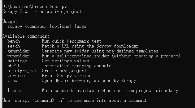 安装完成后,输入``scrapy`测试一下,出现如下图显示,即安装成功。
