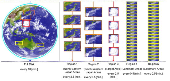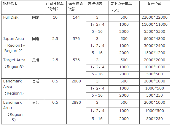H-8搭载高级成像仪(AHI)能扫描五个区域:Full Disk(全球范围)、Japan Area(两个日本地区的范围)、特定区域(两个范围)、地标性区域(两个范围)。用于拍摄全球范围和日本地区的扫描范围是固定的,其他的两个特定区域和地标性区域是可以灵活调整的,不论是哪种拍摄模式,时间分辨率最少都能达到10分钟,观测范围和时间分辨率见下图表。