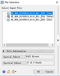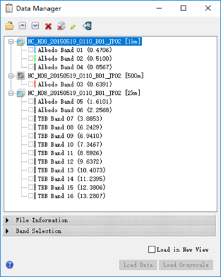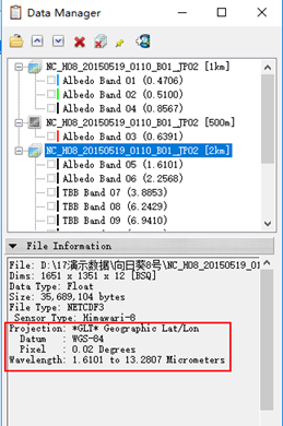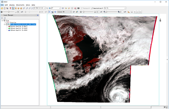 打开菜单File > Open As > Optical Sensors > Himawari-8,选择任意一个.nc文件,点击Open File,数据在ENVI中打开并自动分为3个数据集,分别是:1000米分辨率的1、2、4波段反射率;500米分辨率的第3波段反射率数据;2000米分辨率的5、6波段反射率数据和7-16波段的亮温数据(TBB)。三个数据集的地理区域相同。