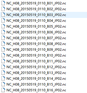 Himawari-8数据的标准数据产品是NetCDF3格式的,数据以.zip压缩包提供,解压后包含16个压缩的文件,逐个解压,得到16个.nc文件。