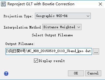 下面基于GLT对数据做几何定位,打开针对低分辨率数据的GLT几何校正工具/Geometric Correction/Reproject GLT with Bowtie Correction,选择要做几何校正的数据集,这里选择1、2、4波段的数据集,点击OK,