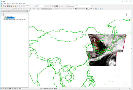 得到的结果是具有地理坐标的数据,加载ENVI自带的全球矢量数据,File->Open World Data->Countries,可以看到数据的范围,覆盖了一小部分中国东部海域。