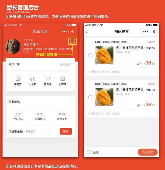 二:社区拼团商城的主要模式:团拼+现阶段社区团购的主要模式是:以二线城市的实体真正住宅小区为单位,线上创建微信群,招收社区产后妈妈、住宅小区便利店店长、快递网点工作人员为团长,在线平台上微信聊天群内发布产品预定出售和团拼产品信息。消费者提交订单后,再统一性安排发货到住宅小区,消费者到实体取件点提货,成功完成整体。而服务平台则给予品牌、技术、一手货源、货运物流、售后服务中心等支撑。