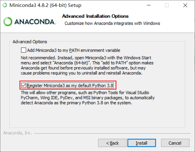 ②选中使用Python3.8作为Miniconda默认环境,如下图所示: