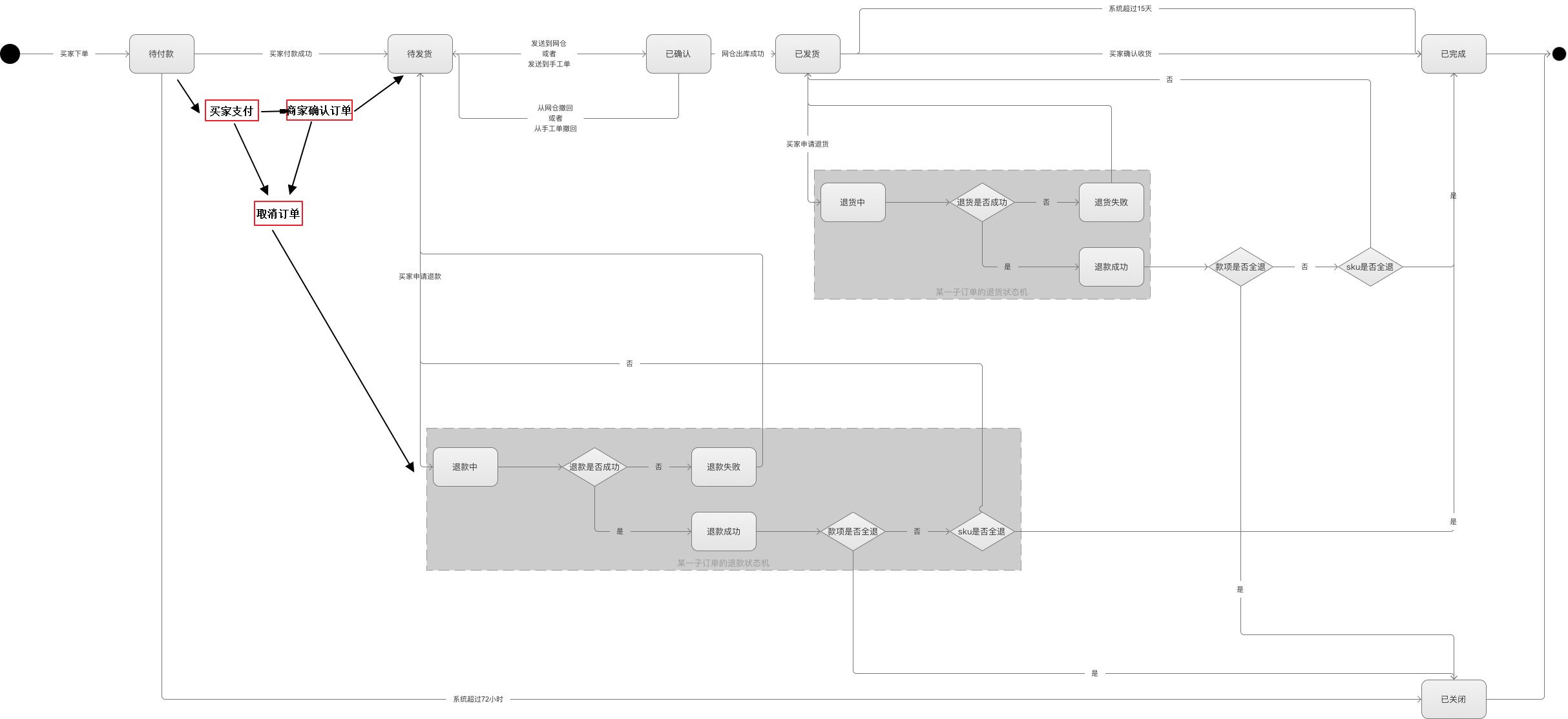 上面的状态扭转时间是可以根据需要来调整,并设计job来做一定的自动补偿(job定时跑任务实现)和人工手动补偿(Oem页面手动触发补偿)的机制,实物商品取消订单,要考虑退款的时效性。