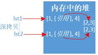 引用类型对象也会copy成另外一份,地址指向不一样。import copy lst1 = [1,[2,3],4] lst2 = copy.deepcopy(lst1) print(id(lst1),id(lst2),lst1 == lst2, lst2) print('=' * 30) lst1[1][0] = 200 # 修改列表的引用类型,不会影响其他列表 print(lst1, lst2) # 输出结果如下: 2378580158344 2378580158280 True [1, [2, 3], 4] ============================== [1, [200, 3], 4] [1, [2, 3], 4]