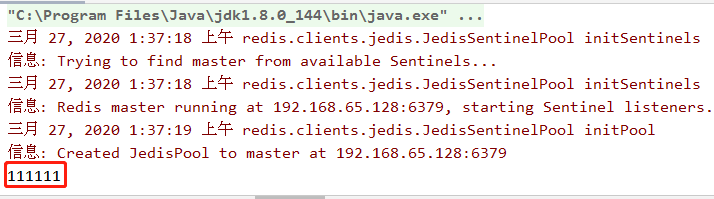 JedisSentinelPool pool = new JedisSentinelPool("mymaster", sentinels, jedisPoolConfig, "123456");