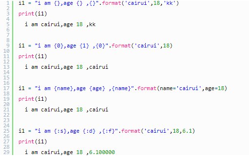 (name) 可选,用于选择指定的key flags 可选,可供选择的值有: + 右对齐:正数的加正号,负数的加负号 - 左对齐:正数前没有负号,负数前加负号 width 可选,占有宽度 .precision 可选,小数点后保留的位数 typecode 必选 s,获取传入的对象__str__方法的返回值,并将其格式化到指定位置 r,获取传入对象的__repr__方法的返回值,并将其格式化到指定位置 c,整数:将数字转换成其unicode对应的值,10进制范围为0 <= i <=1114111 o,将整数转换成八进制表示,并将其格式化到指定位置 x,将整数转换成16进制,并将其格式化到指定位置 d,将整数,浮点数转化为十进制表示,并将其格式化到指定位置