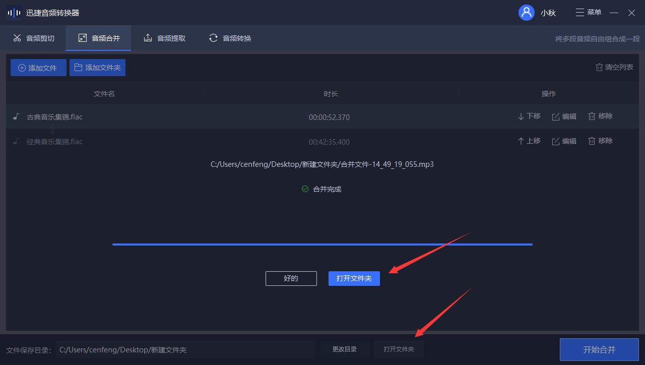 等待片刻音频合并的进度条满(100%)后就表示音频已经合并完成,接着点击‘打开文件夹’选项就可以找到并打开合并后的音频文件了。
