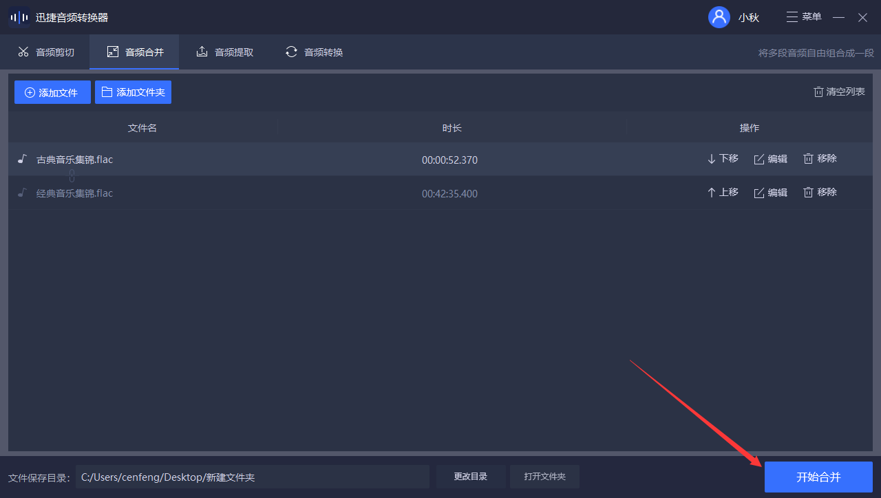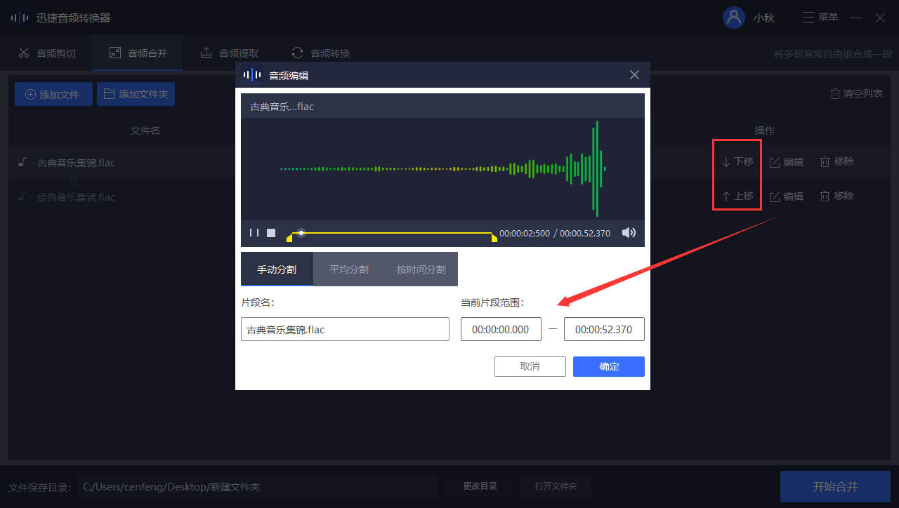 当音频文件添加完毕后,可以通过上移/下移选项调整音频文件合并的前后顺序,也可以通过编辑选项调整单个音频需要合并的片段范围。