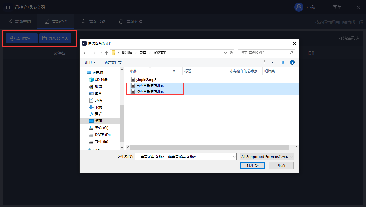 随后音乐合成软件会跳转到音频合并界面,此时要将我们预先准备好的多个音频文件批量添加到该界面。添加时可以点击添加文件/添加文件夹选项根据随后出现的矩形框选择文件,也可以将音频文件直接拖拽到指定区域。两种方式任选其一即可添加音频文件。