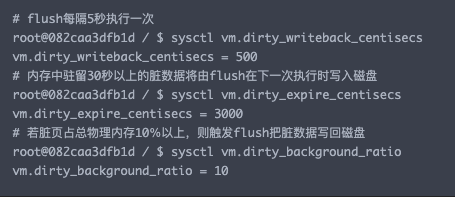 - 当脏页在内存中驻留时间超过特定阈值后,内核需要将超时脏页写到磁盘
