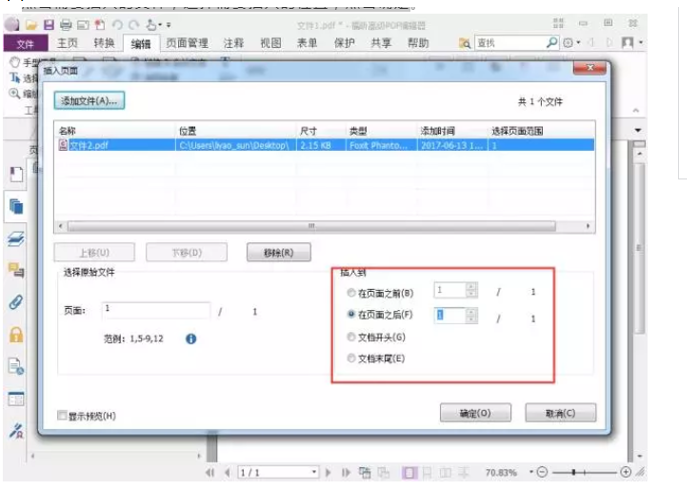 - 点击选择需要插入的文件,选择需要插入的页数,选择需要插入的位置,点击确定,即可完成合并