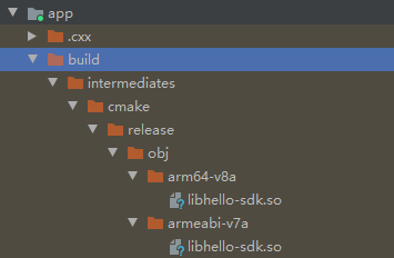 执行externalNativebuild(Release|Debug)(可terminal执行gradlew externalNativebuildRelease或点击Android Studio右侧Gradle中的选项)编译release或debug版本的动态库,这里选择externalNativeBuildRelease,编译结果如下: