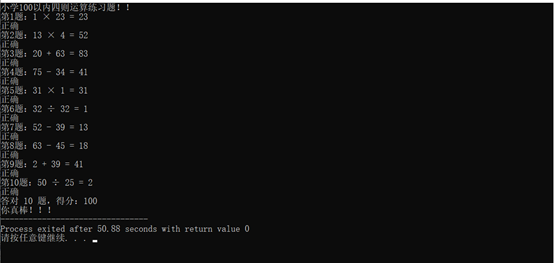 开发一个自动生成小学四则运算题目的命令行 “软件”。实现 输入你要出题的个数,随机产生四则运算,然后用户回答,并且进行打分。 规则:用随机数实现100以内的加、减、乘、除运算,其中和与积不能超过100,差不为负(即须大减小),商不为小数或分数(即必须整除)。 要求总计输出10个运算式,每输出一个运算式,等待输入结果,然后进行对错判断并输出。最后输出统计答对的题数与分