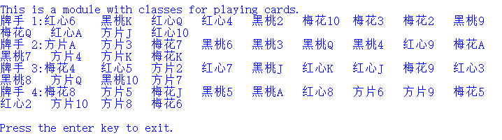 def deal(self,hands,per_hand = 13): # 发牌,每人默认13张牌