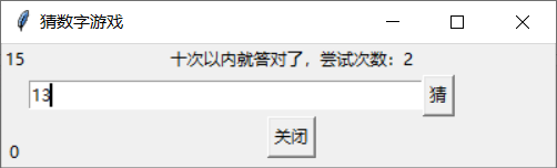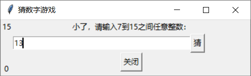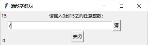 import tkinter as tk import sys import random import re number = random.randint(0,15) running = True num = 0 nmaxn = 15 nminn = 0 def eBtnClose(event): root.destroy() def eBtnGuess(event): # “猜”按钮 global nmaxn # 全局变量 global nminn global num global running if running: val_a = int(entry_a.get()) # 获取猜的数字并转换成数字 if val_a == number: labelqval("恭喜答对了!") num += 1 running = False numGuess() # 显示猜的次数 elif val_a < number: # 猜小了 if val_a >nminn: nminn = val_a # 修改提示猜测范围的最小数 num += 1 labelqval("小了,请输入" + str(nminn) + "到" + str(nmaxn) + "之间任意整数:") else: if val_a < nmaxn: nmaxn = val_a # 修改提示猜测范围的最大数 num += 1 labelqval("大了,请输入" + str(nminn) + "到" + str(nmaxn) + "之间任意整数:") else: labelqval('你答对了') #显示猜的次数 def numGuess(): if num == 1: labelqval('一次答对') elif num < 10: labelqval('十次以内就答对了,尝试次数:' + str(num)) else: labelqval('尝试次数:' + str(num)) def labelqval(vText): label_val_q.config(label_val_q, text = vText) # 修改提示标签文字 root = tk.Tk(className = "猜数字游戏") root.geometry("400x90+200+200") line_a_tip = tk.Frame(root) label_tip_max = tk.Label(line_a_tip,text=nmaxn) label_tip_min = tk.Label(line_a_tip,text=nminn) label_tip_max.pack(side = "top",fill = "x") label_tip_min.pack(side = "bottom",fill = "x") line_a_tip.pack(side = "left",fill = "y") line_question = tk.Frame(root) label_val_q = tk.Label(line_question, width = "80") # 提示标签 label_val_q.pack(side = "left") line_question.pack(side = "top",fill = "x") line_input = tk.Frame(root) entry_a = tk.Entry(line_input, width = "40") # 文本框 btnGuess = tk.Button(line_input, text = "猜") # “猜”按钮 entry_a.pack(side = "left") entry_a.bind('<Return>', eBtnGuess) btnGuess.bind('<Button-1>', eBtnGuess) # “猜” btnGuess.pack(side = "left") line_input.pack(side = "top",fill = "x") line_btn = tk.Frame(root) btnClose = tk.Button(line_btn, text = "关闭") # “关闭” btnClose.bind('<Button-1>', eBtnClose) btnClose.pack(side = "left") line_btn.pack(side="top") labelqval("请输入0到15之间任意整数:") entry_a.focus_set() print(number) root.mainloop()