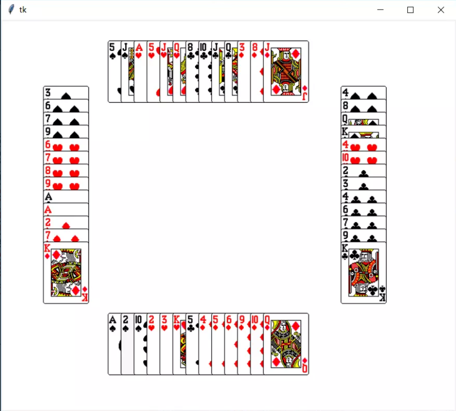 from tkinter import * import random n=52 def gen_pocker(n): x=100 while(x>0): x=x-1 p1=random.randint(0,n-1) p2=random.randint(0,n-1) t=pocker[p1] pocker[p1]=pocker[p2] pocker[p2]=t return pocker pocker=[i for i in range(n)] pocker=gen_pocker(n) print(pocker) (player1,player2,player3,player4)=([],[],[],[]) (p1,p2,p3,p4)=([],[],[],[]) root = Tk() cv = Canvas(root,bg = 'white',width = 700,height = 600) imgs=[] for i in range(1,5): for j in range(1,14): imgs.insert((i-1)*13+(j-1),PhotoImage(file=r'C:\Users\76096\Desktop\2D\2\images\\'+str(i)+'-'+str(j)+'.gif')) for x in range(13): m=x*4 p1.append(pocker[m]) p2.append(pocker[m+1]) p3.append(pocker[m+2]) p4.append(pocker[m+3]) p1.sort() p2.sort() p3.sort() p4.sort() for x in range(0,13): img=imgs[p1[x]] player1.append(cv.create_image((200+20*x,80),image=img)) img = imgs[p2[x]] player2.append(cv.create_image((100,150+20*x), image=img)) img = imgs[p3[x]] player3.append(cv.create_image((200 + 20 * x,500), image=img)) img = imgs[p4[x]] player4.append(cv.create_image((560,150+20*x), image=img)) print("player1:",player1) print("player2:",player2) print("player3:",player3) print("player4:",player4) cv.pack() root.mainloop()