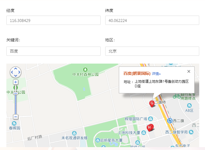 <template><div><a-row:gutter="16"><a-col:span="12"><a-form-itemv-if="map.isAdd" label="关键词"><a-inputv-model="map.keyword"/></a-form-item></a-col><a-col:span="12"><a-form-itemv-if="map.isAdd" label="地区"><a-inputv-model="map.location"/></a-form-item></a-col></a-row><baidu-mapclass="map" :center="map.center" :zoom="map.zoom" @ready="handler"><bm-navigationanchor="BMAP_ANCHOR_TOP_LEFT"></bm-navigation><bm-geolocationanchor="BMAP_ANCHOR_BOTTOM_RIGHT" :showAddressBar="true" :autoLocation="true"></bm-geolocation><bm-local-searchv-if="map.isAdd" class="search" :keyword="map.keyword" :auto-viewport="true" :location="map.location"></bm-local-search></baidu-map></div></template><script>export default {name: "simple-map",props: {map: {type: Object}},data: () => ({}),methods: {handler ({BMap, map}) {let me = this;console.log(BMap, map)// 鼠标缩放map.enableScrollWheelZoom(true);// 点击事件获取经纬度map.addEventListener('click', function (e) {console.log(e.point.lng, e.point.lat)me.$emit('select-location', {lng: e.point.lng,lat: e.point.lat});})}}}</script><stylescoped>.map {width: 100%;height: 400px;}.map .search{margin-bottom: 65px;}</style>