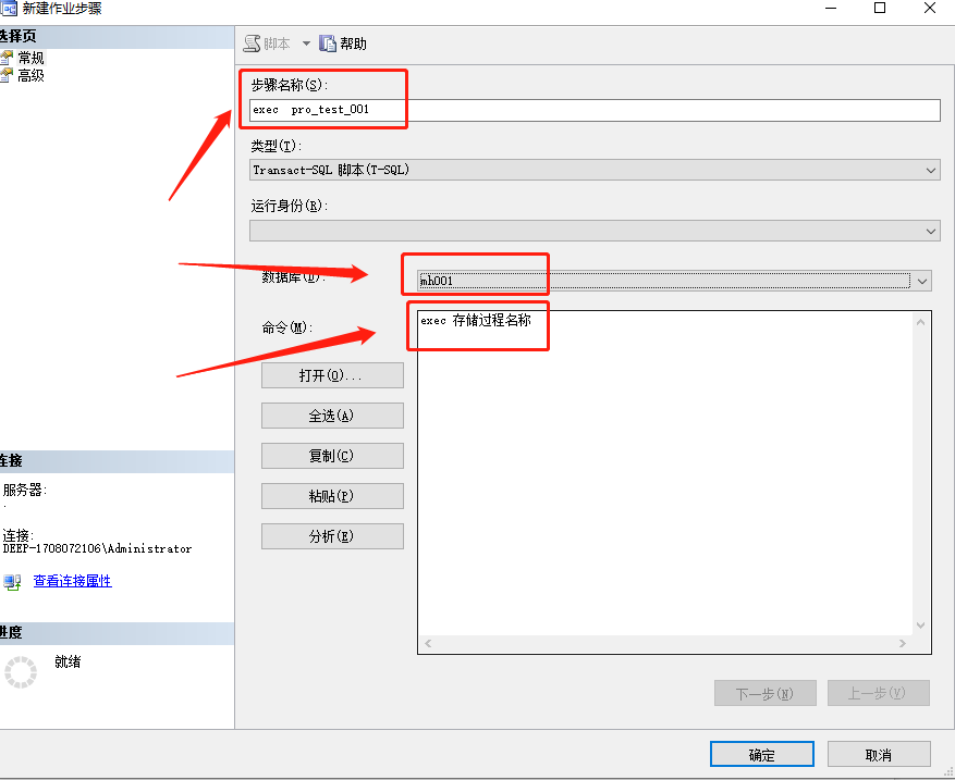 注意选择存储过程所在的数据库,录入需要执行的命令:exec pr_test ,确定保存。若有其它参数命令也可以编写