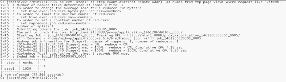 select‘step1’ as step ,count(distinct remote_order) as number from tmp_page_views where request like '%/iterm%';