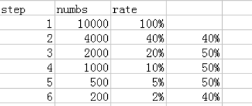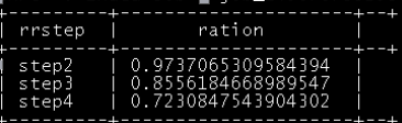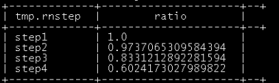 select tmp.rnstep as step,tmp.rnnumbs as numbs,tmp.rnnumbs/tmp.rrnumbs as ratio