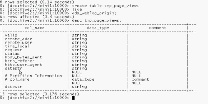 create table tmp_page_views like ods_weblog_origin;创建一个像 ods_weblog_origin这个表格式的表