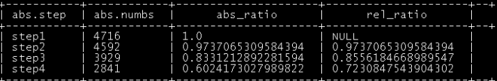 3.查询每一步骤相对于上一步骤的漏出率