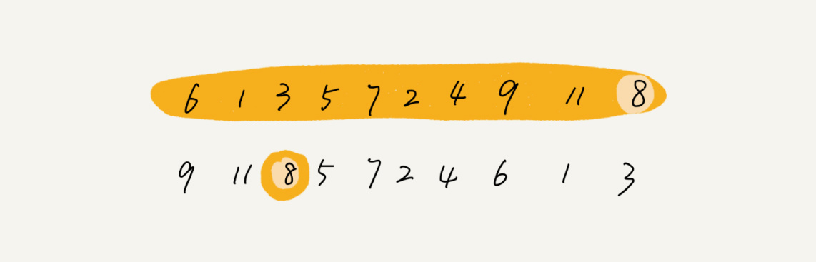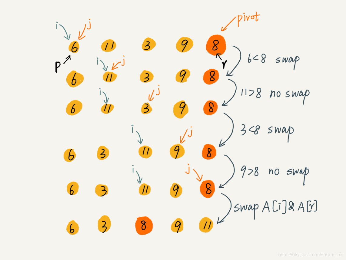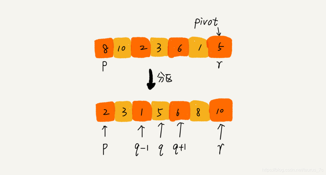 我们选择数组区间 A[0…n-1]的最后一个元素 A[n-1]作为 pivot,对数组 A[0…n-1]原地分区,这样数组就分成了三部分,A[0…p-1]、A[p]、A[p+1…n-1]。