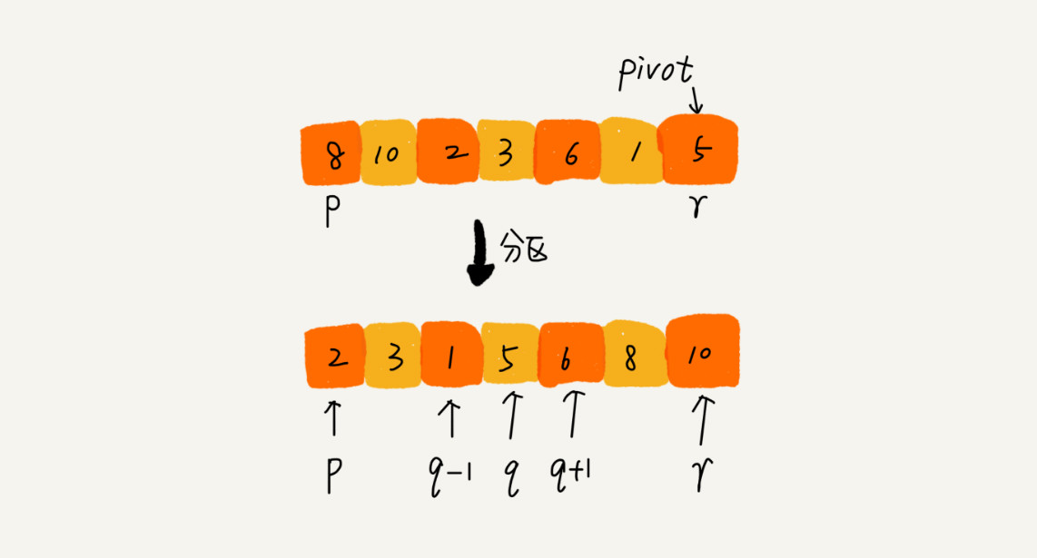 我们遍历 p 到 r 之间的数据,将小于 pivot 的放到左边,将大于 pivot 的放到右边,将 pivot 放到中间。经过这一步骤之后,数组 p 到 r 之间的数据就被分成了三个部分,前面 p 到 q-1 之间都是小于 pivot 的,中间是 pivot,后面的 q+1 到 r 之间是大于 pivot 的。