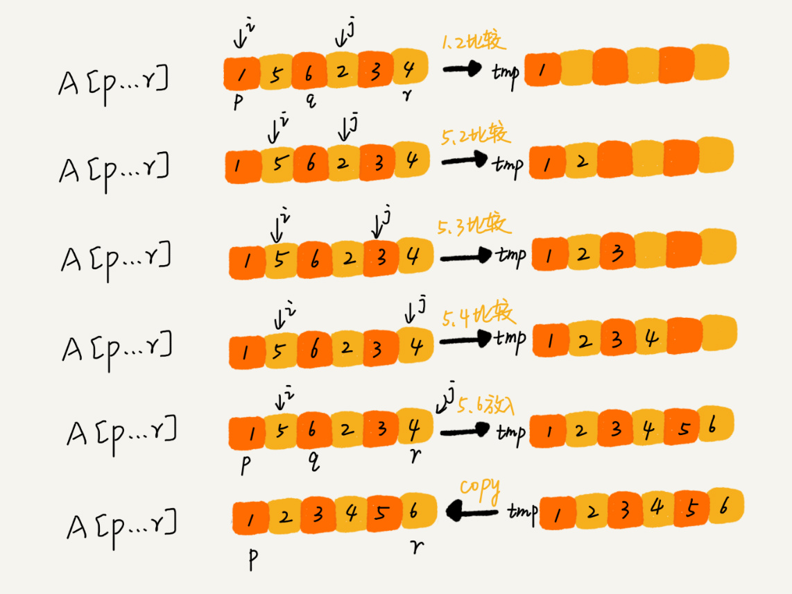 我们申请一个临时数组 tmp,大小与 A[p…r]相同。我们用两个游标 i 和 j,分别指向 A[p…q]和 A[q+1…r]的第一个元素。比较这两个元素 A[i]和 A[j],如果 A[i]<=A[j],我们就把 A[i]放入到临时数组 tmp,并且 i 后移一位,否则将 A[j]放入到数组 tmp,j 后移一位。