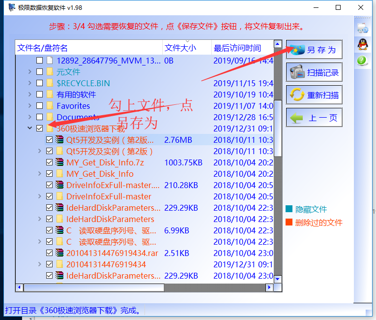 步骤4:勾上想要寻回的文件,点《另存为》按钮,将文件复制出来。