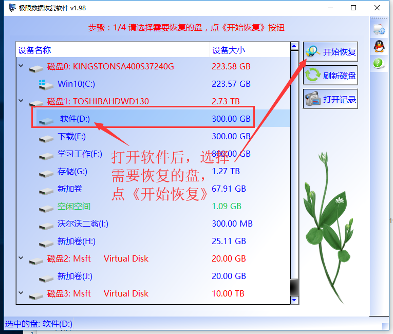 步骤1:先百度搜索并下载软件运行后,在软件中选择需要恢复的盘,点《开始恢复》按钮,软件会对这个盘扫描,将所有找到的数据都显示出来.