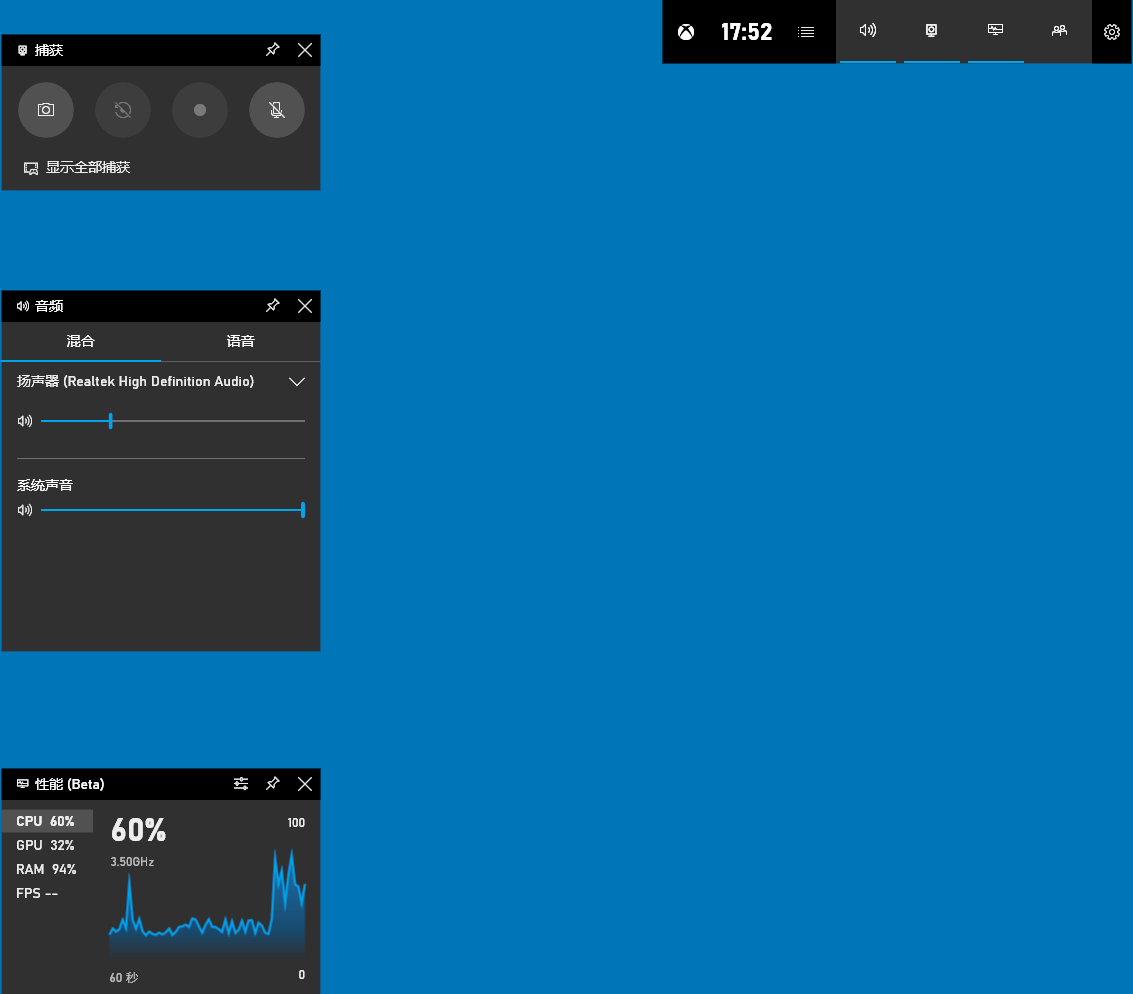 除了使用第三方录屏软件外部分win10点击还会自带基于‘Xbox’而来的录屏方式,这种录屏的激活方式为win+G组合键(默认快捷键)。激活后可以在‘音频’栏调整录制的音频效果,以及通过‘捕获’栏的‘开始录制’按钮对当前屏幕内容进行录制。