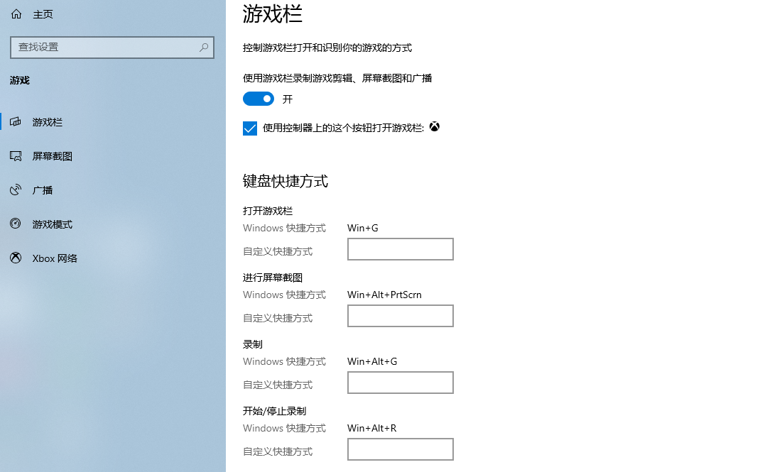 在使用win10自带录屏软件时可以通过系统设置的‘游戏栏’调整激活录制工具等多项快捷键。