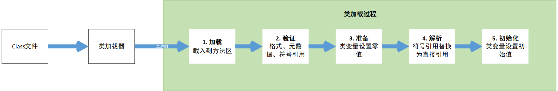 虚拟机将class文件中数据加载到内存,并对其进行验证、解析和初始化,最终形成虚拟机可以使用的Java类型的过程,称之为“类加载机制”,在这里主要将加载过程分为“加载”、“验证”、“准备”、“解析”、“初始化”五个阶段。