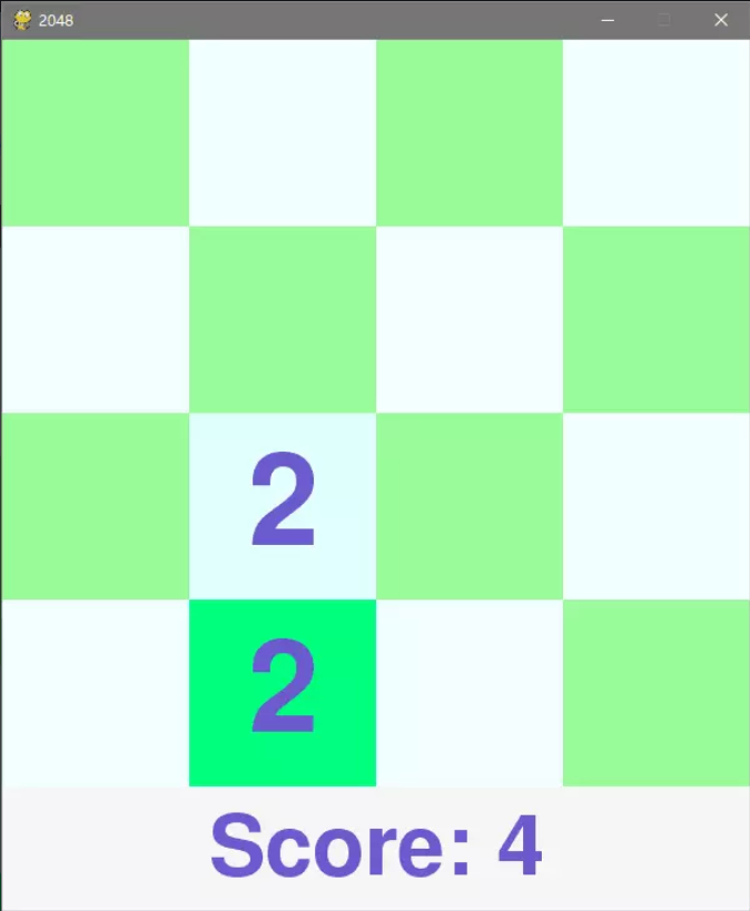 import random import sys import pygame from pygame.locals import * PIXEL = 150 SCORE_PIXEL = 100 SIZE = 4 # 地图的类 class Map: def __init__(self, size): self.size = size self.score = 0 self.map = [[0 for i in range(size)] for i in range(size)] self.add() self.add() # 新增2或4,有1/4概率 def add(self): while True: p = random.randint(0, self.size * self.size - 1) if self.map[p // self.size][p % self.size] == 0: x = (random.randint(0, 3) > 0 and 2) or 4 self.map[p // self.size][p % self.size] = x self.score += x break # 地图向左靠拢,其他方向的靠拢可以通过适当旋转实现,返回地图是否更新 def adjust(self): changed = False for a in self.map: b = [] last = 0 for v in a: if v != 0: if v == last: b.append(b.pop() << 1) last = 0 else: b.append(v) last = v b += [0] * (self.size - len(b)) for i in range(self.size): if a[i] != b[i]: changed = True a[:] = b return changed # 逆时针旋转地图90度 def rotate90(self): self.map = [[self.map[c][r] for c in range(self.size)] for r in reversed(range(self.size))] # 判断游戏结束 def over(self): for r in range(self.size): for c in range(self.size): if self.map[r][c] == 0: return False for r in range(self.size): for c in range(self.size - 1): if self.map[r][c] == self.map[r][c + 1]: return False return True def moveUp(self): self.rotate90() if self.adjust(): self.add() self.rotate90() self.rotate90() self.rotate90() def moveRight(self): self.rotate90() self.rotate90() if self.adjust(): self.add() self.rotate90() self.rotate90() def moveDown(self): self.rotate90() self.rotate90() self.rotate90() if self.adjust(): self.add() self.rotate90() def moveLeft(self): print('90') if self.adjust(): self.add() # 更新屏幕 def show(map): for i in range(SIZE): for j in range(SIZE): # 背景颜色块 screen.blit(map.map[i][j] == 0 and block[(i + j) % 2] or block[2 + (i + j) % 2], (PIXEL * j, PIXEL * i)) # 数值显示 if map.map[i][j] != 0: map_text = map_font.render(str(map.map[i][j]), True, (106, 90, 205)) text_rect = map_text.get_rect() text_rect.center = (PIXEL * j + PIXEL / 2, PIXEL * i + PIXEL / 2) screen.blit(map_text, text_rect) # 分数显示 screen.blit(score_block, (0, PIXEL * SIZE)) score_text = score_font.render((map.over() and "Game over with score " or "Score: ") + str(map.score), True, (106, 90, 205)) score_rect = score_text.get_rect() score_rect.center = (PIXEL * SIZE / 2, PIXEL * SIZE + SCORE_PIXEL / 2) screen.blit(score_text, score_rect) pygame.display.update() map = Map(SIZE) pygame.init() screen = pygame.display.set_mode((PIXEL * SIZE, PIXEL * SIZE + SCORE_PIXEL)) pygame.display.set_caption('2048') block = [pygame.Surface((PIXEL, PIXEL)) for i in range(4)] # 设置颜色 block[0].fill((152, 251, 152)) block[1].fill((240, 255, 255)) block[2].fill((0, 255, 127)) block[3].fill((225, 255, 255)) score_block = pygame.Surface((PIXEL * SIZE, SCORE_PIXEL)) score_block.fill((245, 245, 245)) # 设置字体 map_font = pygame.font.Font(None, PIXEL ) score_font = pygame.font.Font(None, SCORE_PIXEL) clock = pygame.time.Clock() show(map) while not map.over(): # 12为实验参数 clock.tick(12) for event in pygame.event.get(): if event.type == QUIT: sys.exit() keys = pygame.key.get_pressed() if keys[K_w] or keys[K_UP]: map.moveUp() elif keys[K_s] or keys[K_DOWN]: map.moveDown() elif keys[K_a] or keys[K_LEFT]: map.moveLeft() elif keys[K_d] or keys[K_RIGHT]: map.moveRight() show(map) # 游戏结束 pygame.time.delay(3000)