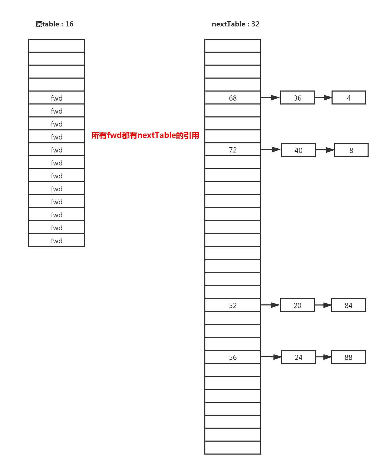 3、使用nextn记录新表长度(2n),创建一个ForwardingNode节点,原table每一个槽位转移完成都会暂时将槽位节点设置成ForwardingNode节点。