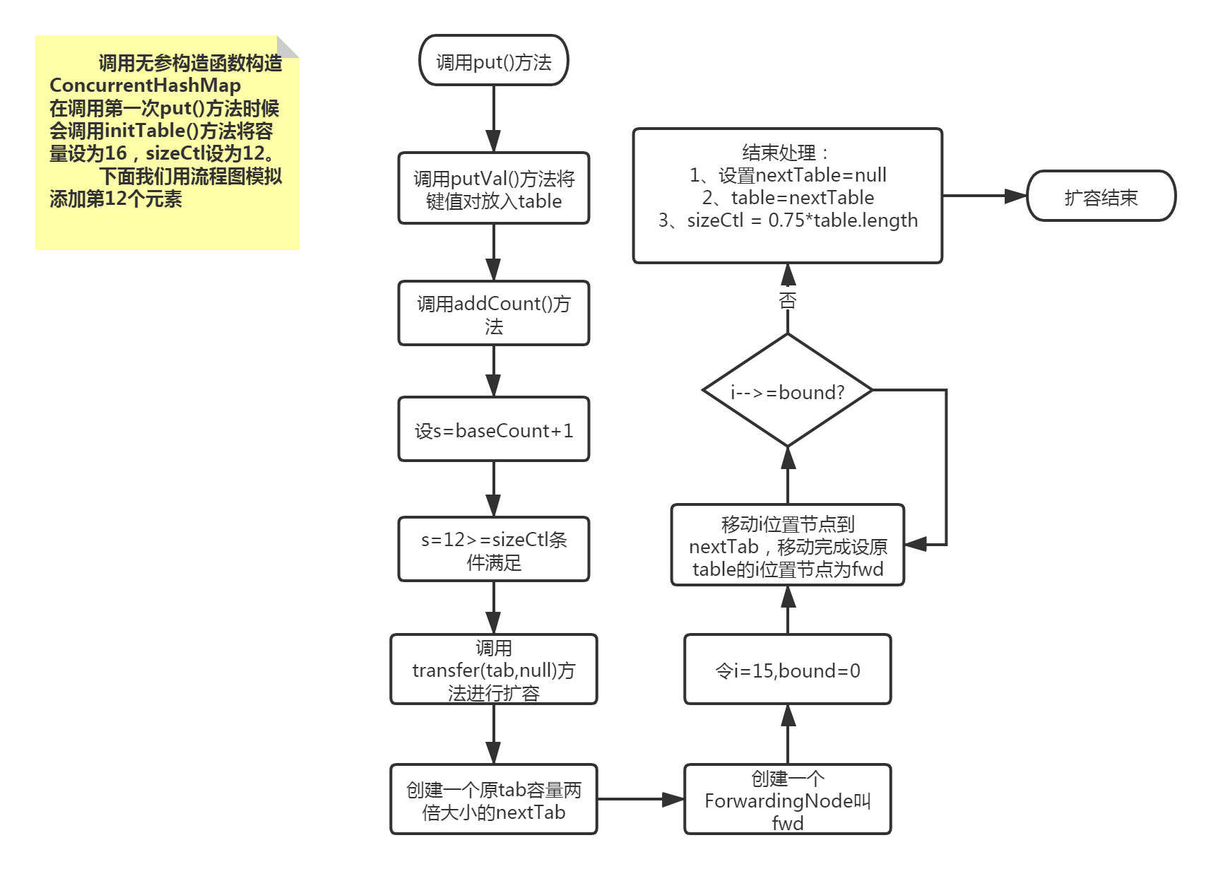 默认容量16,sizeCtl(阈值)为12,添加第12个元素时候的流程图