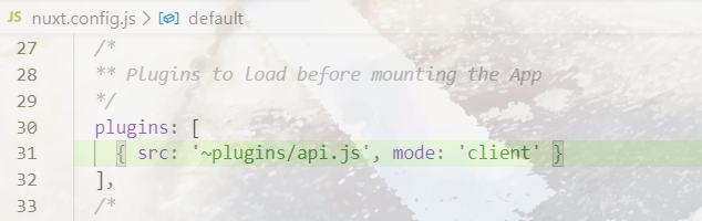 3、修改 nuxt.conf.js,将 api.js 插件模式 改成"client"