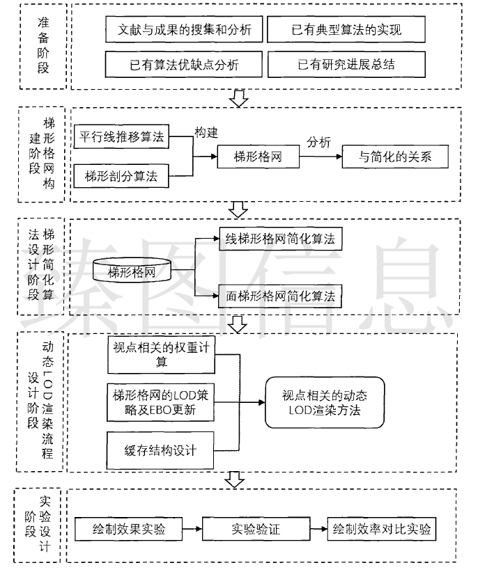 - 动态LOD绘制方法设计。在梯形格网简化算法的基础上,设计梯形格网LOD策略,同时分析地图操作对简化的影响,依据GPU可编程流水管线的原理,设计基于梯形格网的矢量地图动态LOD绘制方法。