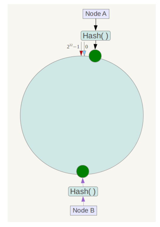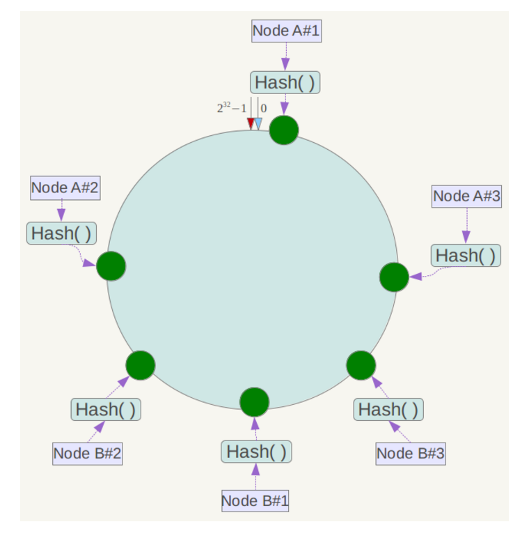 很容易造成数据堆积在节点A,于是一致性哈希算法引入了虚拟节点机制,即对每一个服务节点计算多个哈希,每个计算结果位置都放置一个此服务节点,称为虚拟节点。具体做法可以在服务器ip或主机名的后面增加编号来实现。过程如图