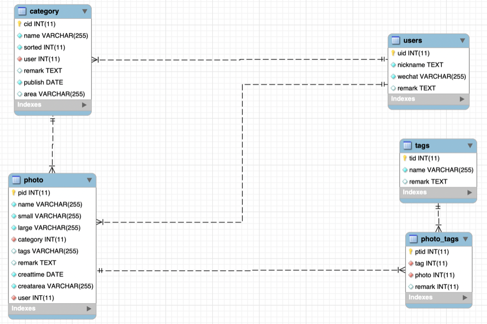 CREATE TABLE `album`.`photo` ( `pid` INT NOT NULL AUTO_INCREMENT , `name` VARCHAR(255) NOT NULL , `small` VARCHAR(255) NOT NULL , `large` VARCHAR(255) NOT NULL , `category` INT NOT NULL , `tags` VARCHAR(255) NULL , `remark` TEXT NULL , `creattime` DATE NOT NULL , `creatarea` VARCHAR(255) NOT NULL , `user` INT NOT NULL , PRIMARY KEY (`pid`)) ENGINE = InnoDB;