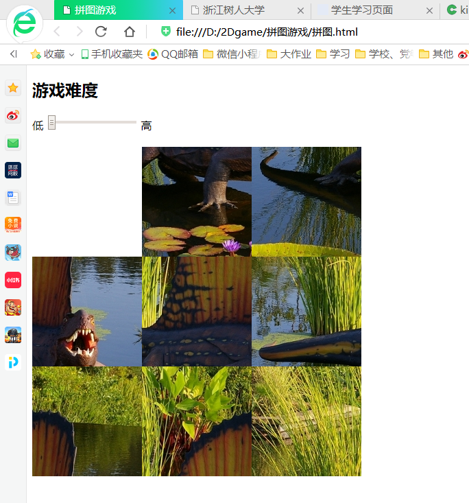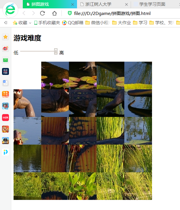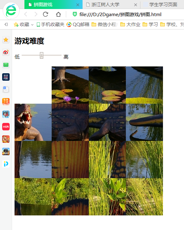 拼图游戏将一幅图片分割成若干拼块并将它们随机打乱顺序。当将所有拼块都放回原位置时,就完成了拼图(游戏结束)。 在“游戏”中,单击滑块选择游戏难易,“容易”为3行3列拼图游戏,中间为一个4行4列拼图游戏,“难”为5行5列拼图游戏。拼块以随机顺序排列,玩家用鼠标单击空白块的四周来交换它们的位置,直到所有拼块都回到原位置。拼图游戏运行结果如图所示。
