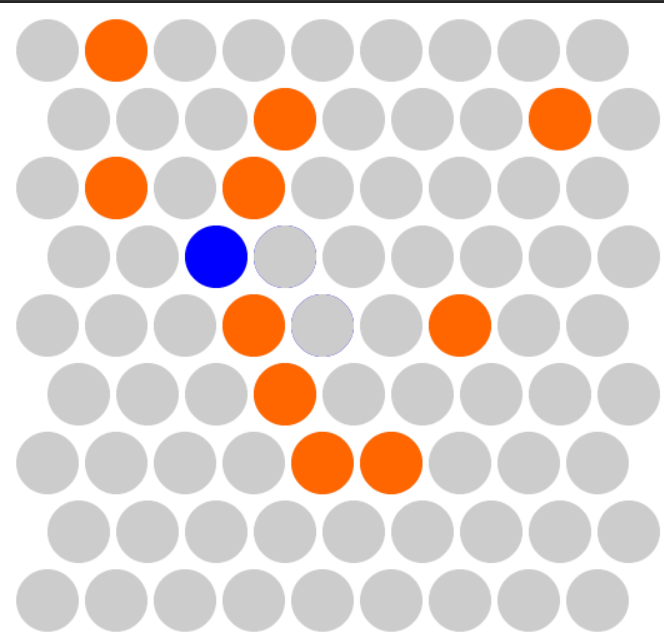 将图中的猫围住(蓝色圆),不让它从旁边跑掉,游戏开始会几个随机分布的格子(橙色),用它围住猫。